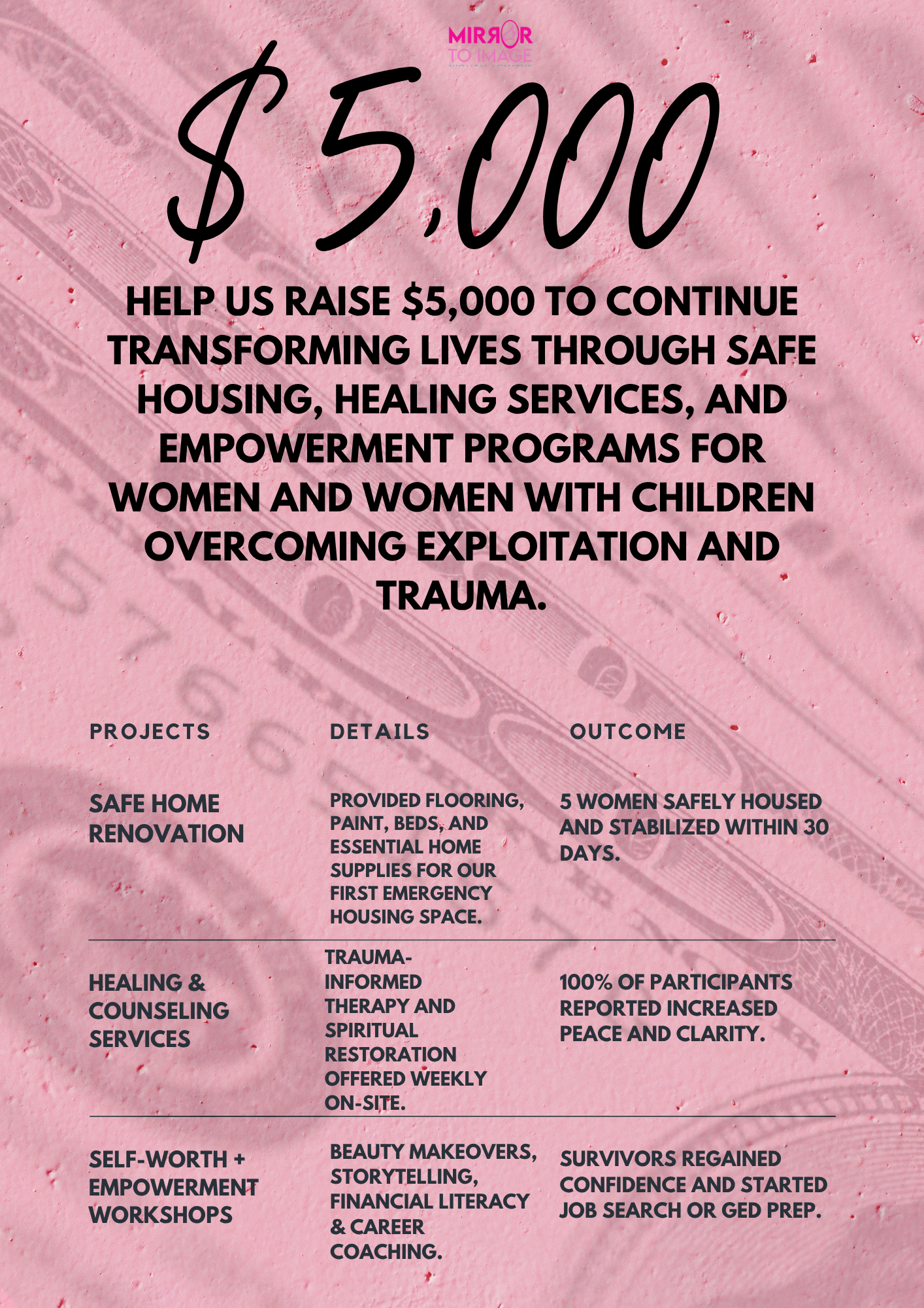 At Mirror to Image, we provide a comprehensive range of trauma-informed programs and services designed to restore, equip, and empower survivors of human trafficking, domestic violence, drug abuse, and other life-altering challenges. Our offerings include: