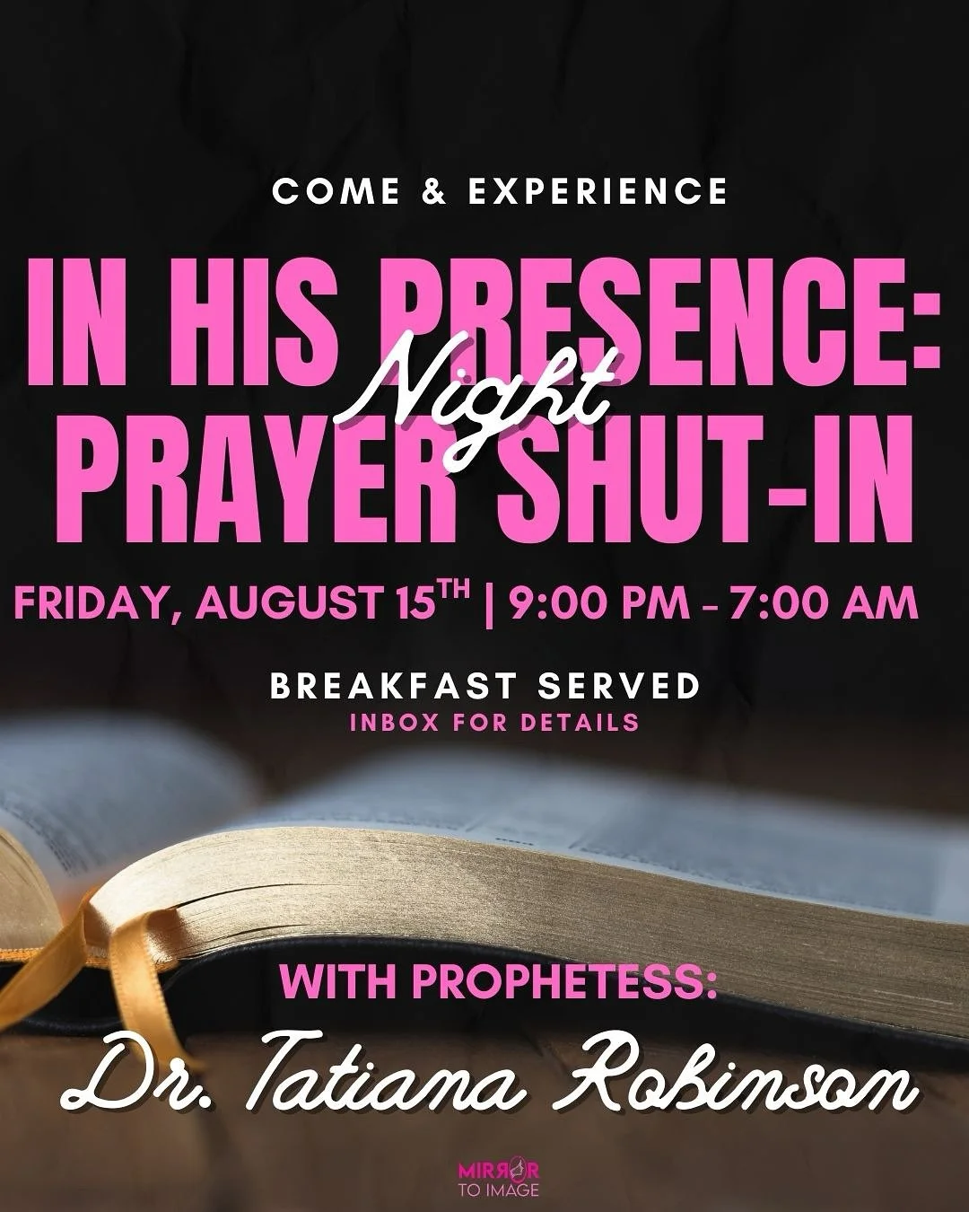 Join us for a powerful all-night encounter in the presence of God at our In His Presence: Night Prayer Shut-In. This sacred gathering will be led by Prophetess Dr. Tatiana Robinson, where we will press in through worship, intercession, and prophetic prayer.